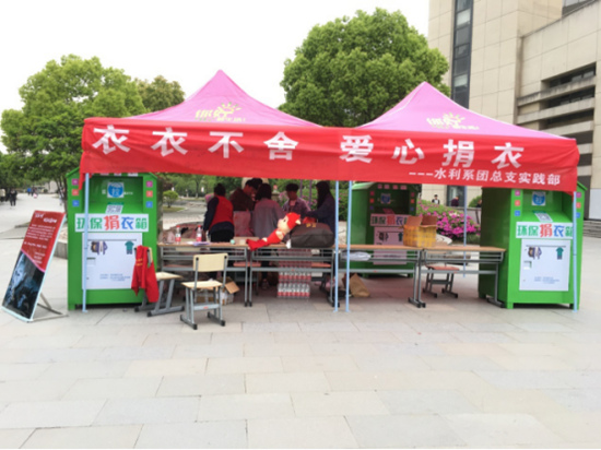 2018年4月16日,水利系团总支联合杭州市“救衣联盟”在我院教工食堂、学生食堂门口开展了“衣衣不舍,爱心捐衣”的志愿服务活动。此次活动旨在宣扬大学生热心助人的精神,将不需要的旧衣物捐赠给山区人口。活动将持续一周,活动所收赠的衣物由杭州益优公益负责运输。活动安置了两个捐衣点:学生食堂门口、教工食堂门口,都有安排志愿者值班。活动举行的第一天就十分火爆,刚摆好捐衣点,就陆陆续续有同学拎了大包的衣物过来。