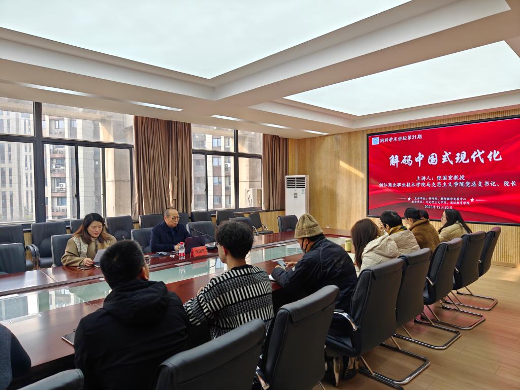 12月20日,学院特邀浙江商业职业技术学院马克思主义学院党总支书记、院长张国宏教授开展题为《解码中国式现代化》的讲座。本次讲座由学院主持工作副院长阮红芳主持。学院专任教师代表30余人参加。