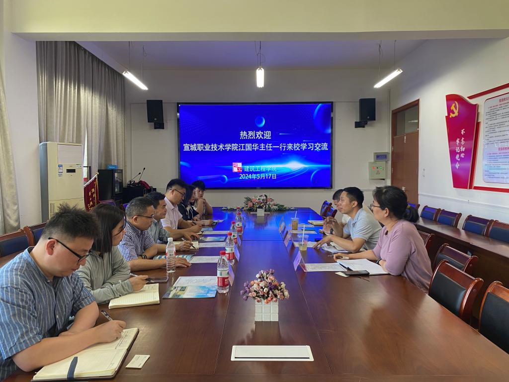 5月16日,宣城职业技术学院建筑艺术系主任江国华一行5人来校交流访问。建工学院学术副院长陈剑,工程造价专业部主任方圆,市政工程技术专业带头人林呀,教学秘书祝叶丹热情接待江国华一行。