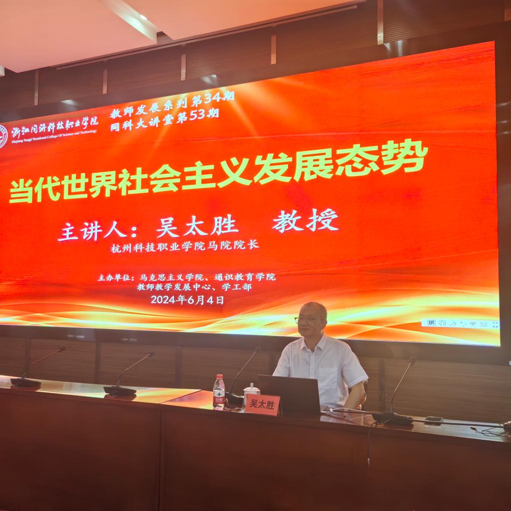6月4日下午,杭州科技职业技术学院马克思主义学院院长吴太胜教授应邀来我校作《当代世界社会主义发展态势》讲座。本次讲座由学校教师发展中心、校学工部共同主办,马克思主义学院承办,马克思主义学院院长阮红芳主持,马院教师、辅导员及建智专业、造价专业学生等近170名师生共同参加本次讲座。