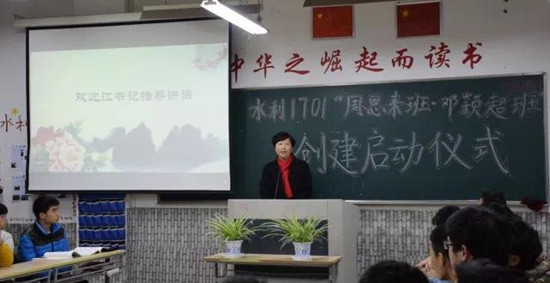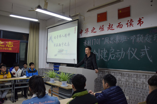 启动仪式上,水利1701班班长胡洋宾汇报了该班级一学期以来同学们的学习生活情况,并结合争创“周恩来班”、“邓颖超班”主题,就该班级开展的一系列主题活动作了专题汇报。