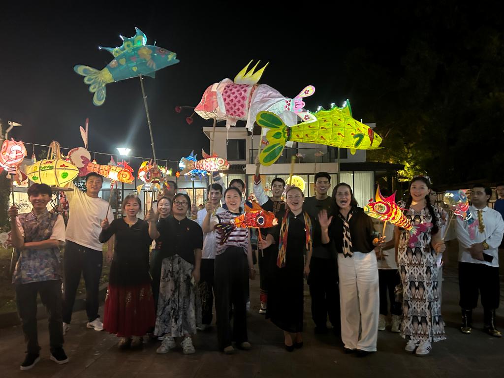 到了夜晚鱼灯巡游环节,灯火映月下,维吾尔族同学随着音乐跳起了舞蹈《月下石榴红》,用优美的舞蹈表达了对祖国的美好期盼。
