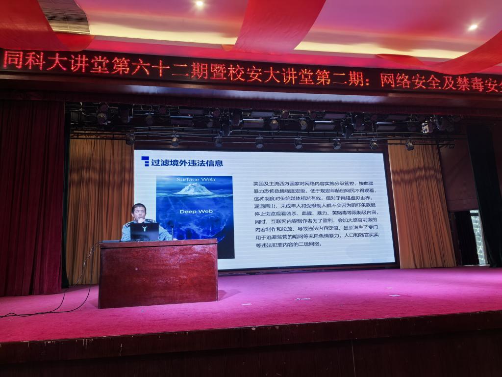 为筑牢校园禁毒防线,增强师生网络安全意识,4月24日下午,学校安保部、学工部联合属地公安举办了同科大讲堂第六十二期暨校安大讲堂第二期——网络安全及禁毒安全讲座。讲座在水韵剧场举行,五个二级学院师生代表共300余人聆听了讲座。