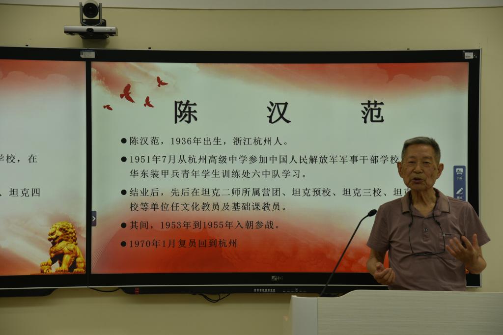 活动现场,88岁高龄的抗美援朝老战士陈汉范用铿锵有力的声音,向在场观众讲述了自己15岁参军报国的经历。当老人回忆起战场上的峥嵘岁月时,现场观众无不为之动容。特别是当陈老深情朗诵自创诗词《老兵吟》时,“十五即从军,甘为一砖固长城”的豪迈誓言、“无愧无憾度今生”的赤诚告白,引发了经久不息的掌声。老战士用生命书写的革命故事,让青年学子们深刻认识到和平的来之不易,也更加坚定了“请党放心,强国有我”的理想信念。活动最后,学生代表向老英雄献上鲜花,全体人员在鲜红的党旗前合影留念,共同记录下这堂生动的思政课。
