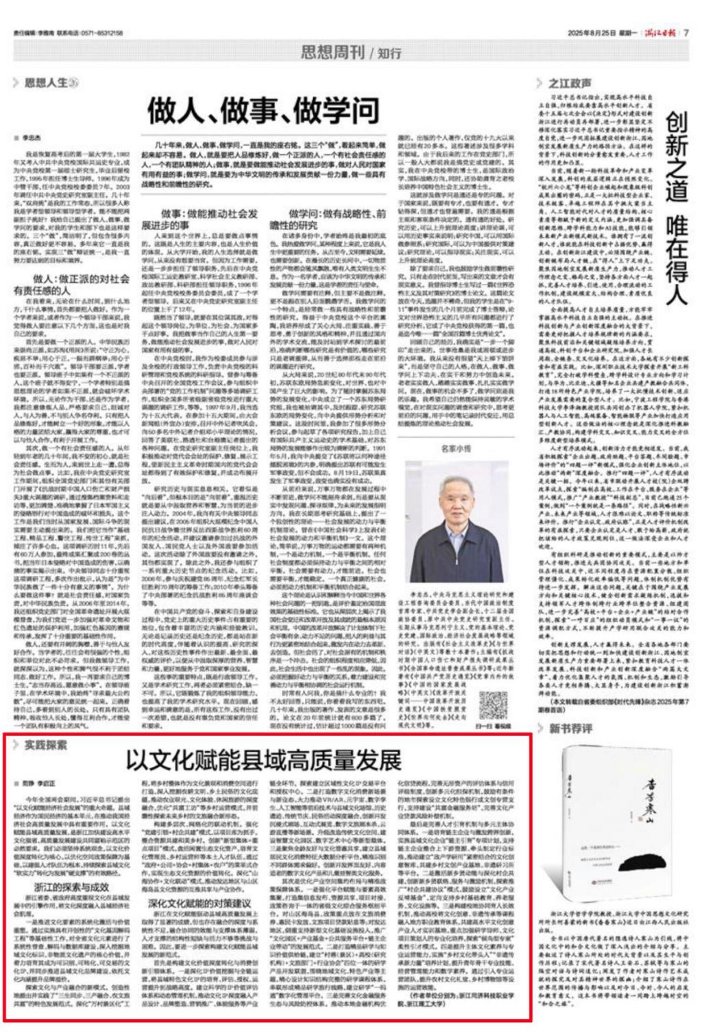 近日,我校艺术设计学院范铮副教授撰写并署名的理论文章《以文化赋能县域高质量发展》在《浙江日报》思想周刊(理论版)刊发。