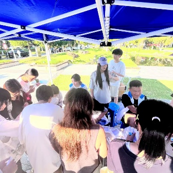 汇声心理站工作人员精心搭建了活动场地,不仅按需准备了尺寸多样的画布、质感细腻的画框,还采购了马克笔与环保颜料,确保每位参与者都能拥有充足创作素材。尽管活动当天午后气温偏高,但丝毫未影响同学们的参与热情——大家或独自静坐于遮阳棚下,手持画笔细细勾勒线条;或三五成群围坐一起,交流创作思路、分享色彩搭配技巧,在笔尖与画布的碰撞中开启一场与心灵的深度对话。