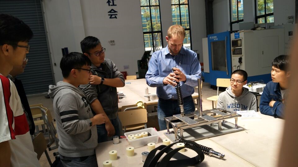 4月14日下午,美国贝茨学院老师Curt和叶炬锋老师一起,在机械制造实训中心现场指导学生,并对本次参赛作品的设计方案、制作流程进行深入探讨。在机电系辅导员何骥昊老师的翻译下,贝茨学院Curt老师与各位学生的沟通流畅顺利,Curt老师的设计理念让同学们受到了很大的启发,极大的开拓了同学们的思维空间。同学们纷纷表示,在Curt老师的指导帮助下,在指导老师认真辅导下,大家对参加大学生机械设计竞赛更有信心了。