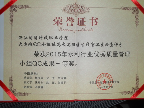 近日,2015年水利行业优秀质量管理小组QC成果发布会在杭州召开。我院2014级大禹班由苏孝敏老师指导的《大禹班QC小组提高大禹班学生寝室卫生检查评分》成果,经中国水利电力质量管理协会专家综合评审,最终获得2015年水利行业优秀质量管理小组QC成果一等奖。这是全国水利高校首次在全国水利行业QC活动中获得的殊荣。
