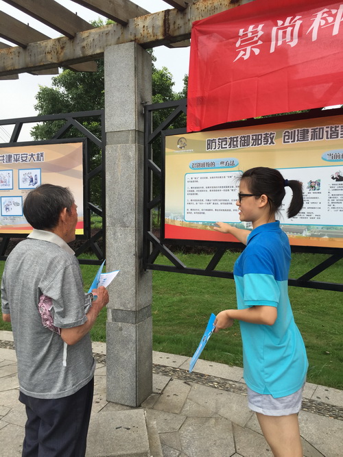 7月22日-23日,学院反邪教暑期社会实践团队来到嘉兴市南湖区,与南湖区610办公室、大桥镇综治办共同开展以“崇尚科学 关爱家庭 珍惜生命 反对邪教”为主题的宣传宣讲活动。
