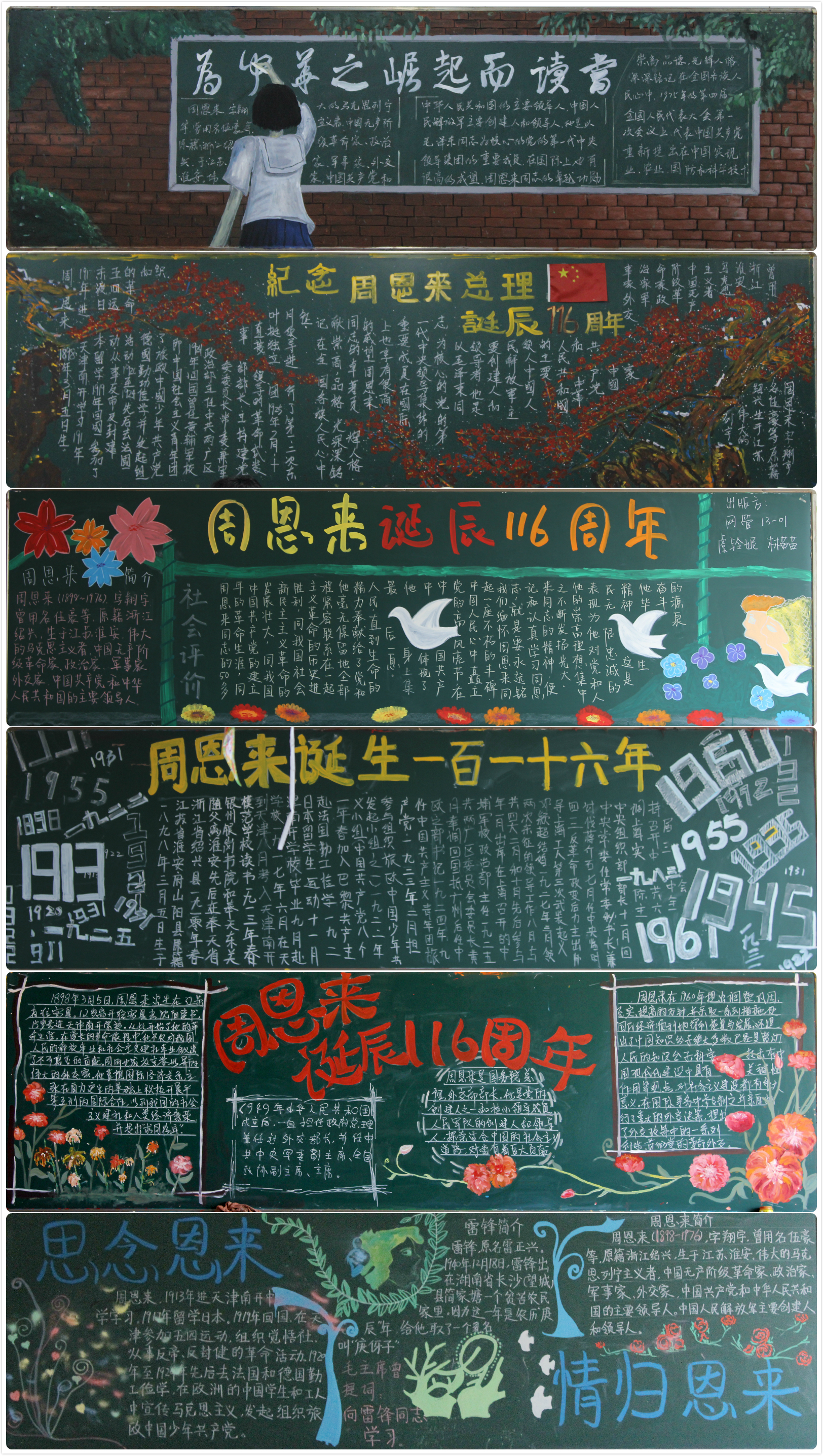 今年是伟大的周恩来总理诞辰116周年,团委开展了多项相关主题的活动,其中有一项活动得到了很多班级的积极响应,那就是“寄情妙笔,情归恩来”班级黑板报比赛。简单的一块黑板报不仅仅给了同学们美的体验,装扮了我们的教室,更是班集体凝聚力和创新力最好的展现。