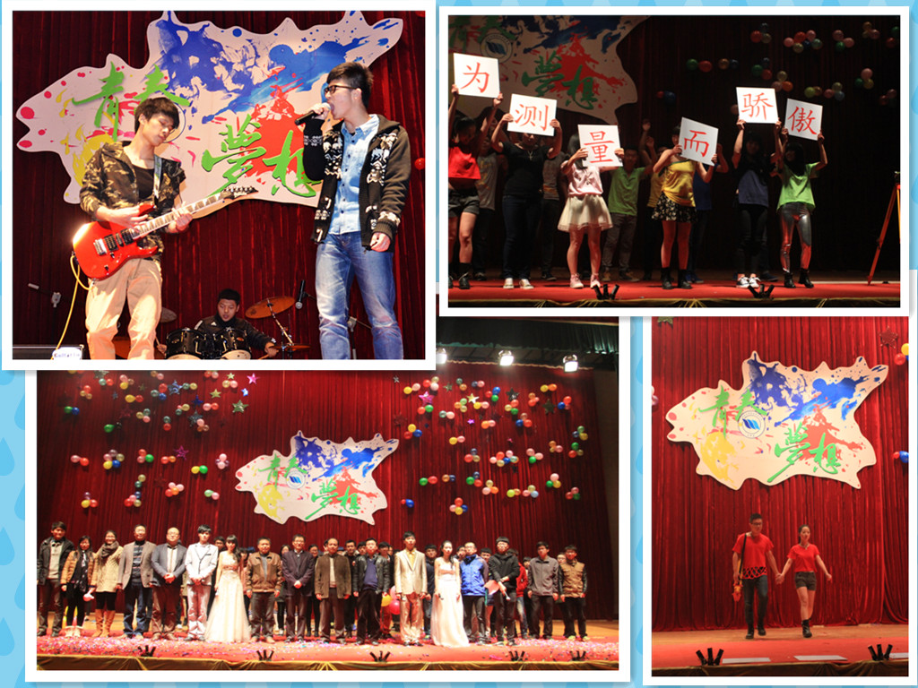 晚会以水利系乐队演奏的《太阳花》拉开了序幕,青春的面孔,青春的魅力,引发台下观众的共鸣。热舞的激情,健美操的韵律在变幻的色彩中冲击着视觉和听觉,青春的节拍将一个个瞬间定格为永恒,为一个个梦想插上了飞翔的翅膀,吉他弹唱《遇见》的旋律唤起心底最美好的回忆,测量13级同学以测量仪器为道具的走秀将晚会推向高潮,晚会以水利系团、学、社干部合唱的一曲《相亲相爱一家人》完美谢幕。