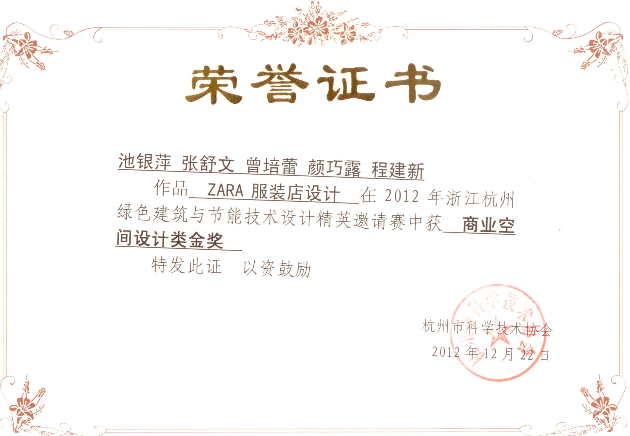 日前,从杭州市科学技术协会传来喜讯,我院学子在德能杯“2012年浙江杭州绿色建筑与节能技术设计精英邀请赛”中再次喜获佳绩。建筑系学生王奇聪同学的设计作品《宁波大学科技学院活动中心》和艺术系学生池银萍等5位同学的设计作品《ZARA服装店设计》荣获金奖,艺术系学生陈若恬同学和建筑系学生王坚同学的设计作品分别获得银奖,同时还有二件作品获得铜奖。艺术系陈旭彤、王蕊、宋扬和建筑系张燕、王涛、张艳共6位老师获得优秀指导老师奖,艺术系获得优秀组织单位奖。