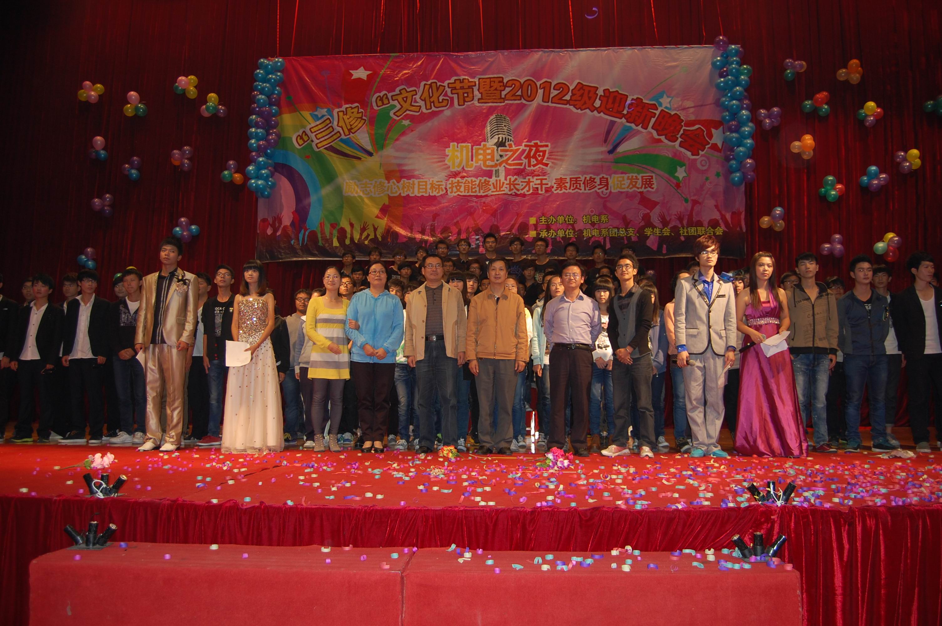 为了巩固落实机电系“三修”品牌文化建设成果,更好推进“三修”品牌文化建设和宣传动员工作,扩大“三修”文化在机电系广大师生层面的影响力,机电系于10月23日在文体中心隆重举办了“三修”文化建设推进月活动开幕式暨2012级迎新互动晚会。全体系领导、在校班主任和学生共计1000多人参加了此次文化盛宴。