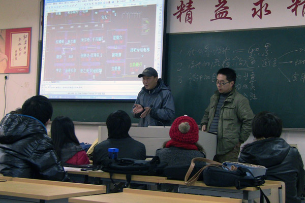 孙总为学生们讲述了商业空间设计的情况。他告诉大家,设计是一种积累的过程,生活中处处存在着设计,作为一名设计者要有敏锐的审视力,想得到既能做得到。他就商业空间设计的流程进行讲解,即沟通、定位、再进行功能、环境、实用的总体设计,而设计的目的则为了经营者、消费者和品牌等方面,并表示设计是一种实用艺术-。