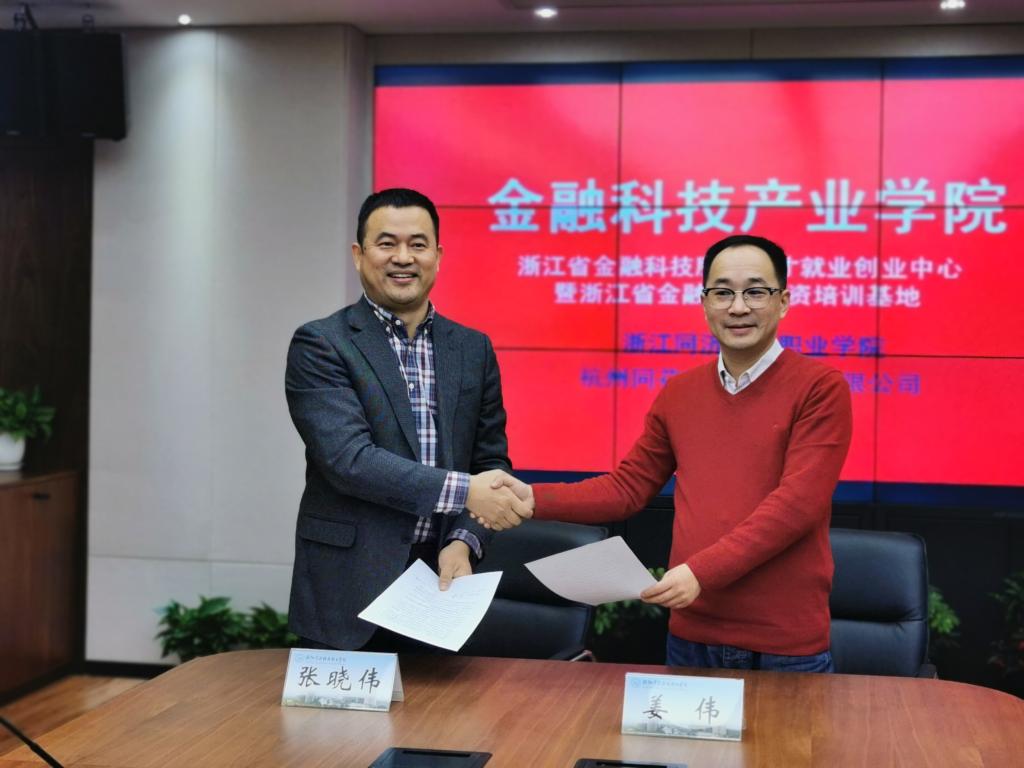 最后,姜伟副院长和张晓伟总监分别代表学校和企业签订了校企战略合作协议,并为“金融科技产业学院 浙江省金融科技服务人才就业创业中心暨浙江省金融科技师资培训基地”授牌。