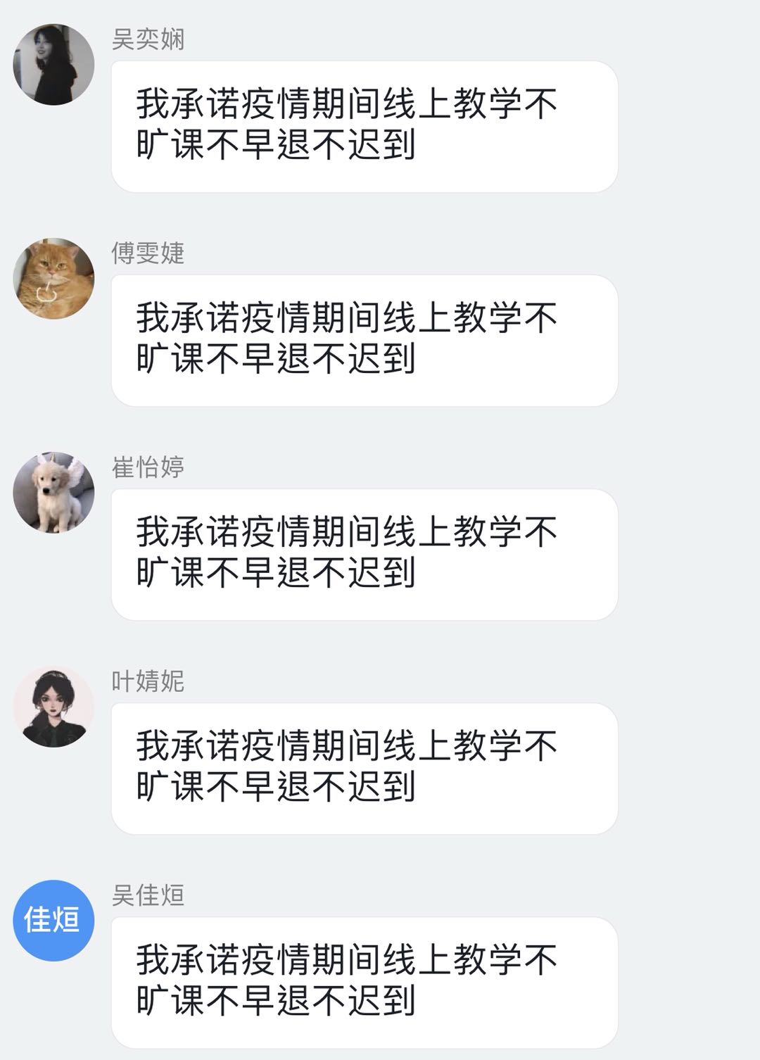上线先点到,决不让任何一个学生掉线。建工系严格按照学校部署要求,高度重视,认真组织,精心策划,启动“辅导员+班主任+班干部”三级联动机制,主题班会上主要围绕线上教学、疫情防控、思想引领等方面内容开展,有的班主任通过发挥学生干部和学生党员的先锋模范作用,建立“疫伴帮扶小组”,微信、QQ、电话一对一帮扶小组,在班群进行学习打卡,互相叫对方起床等方式掌握学生学习动态和健康状况,有的班主任向同学们讲解疫情期间保持心理健康和进行心理疏导的正确方式,有的班主任向班级同学宣讲最美逆行者们的英雄事迹,推荐各类书籍……最后,每位学生都在线上参与了“线上教学质量保障我承诺”的接龙签名活动。