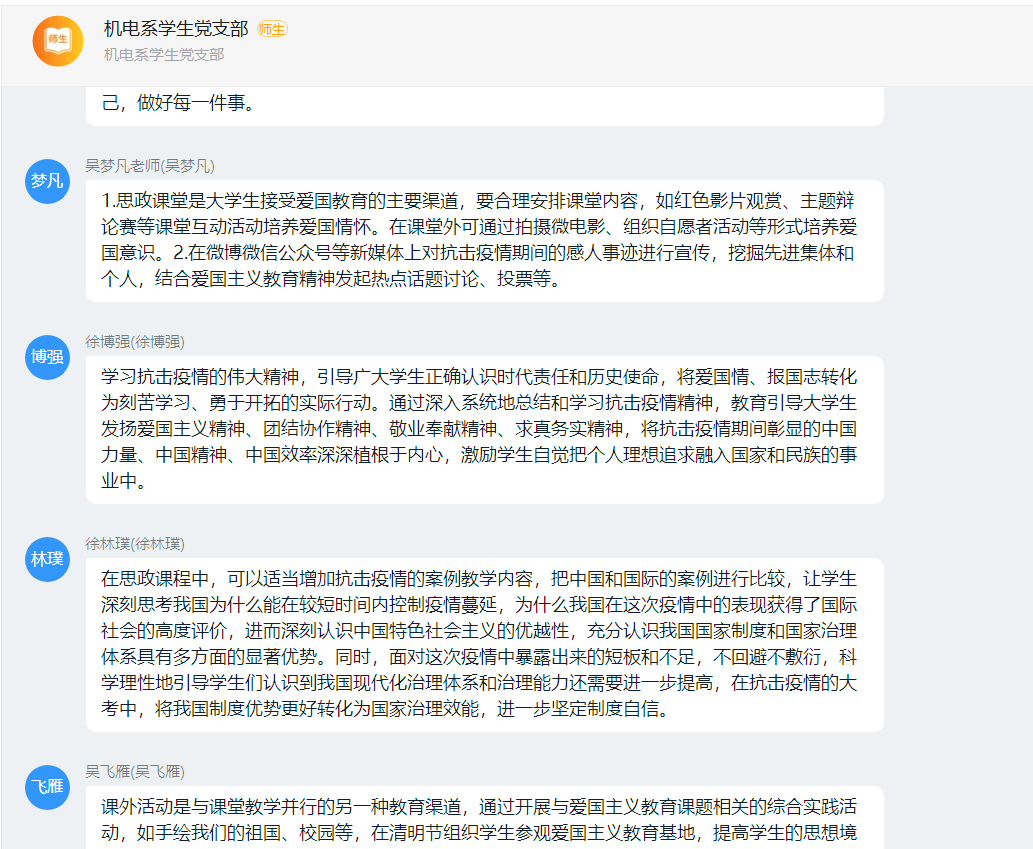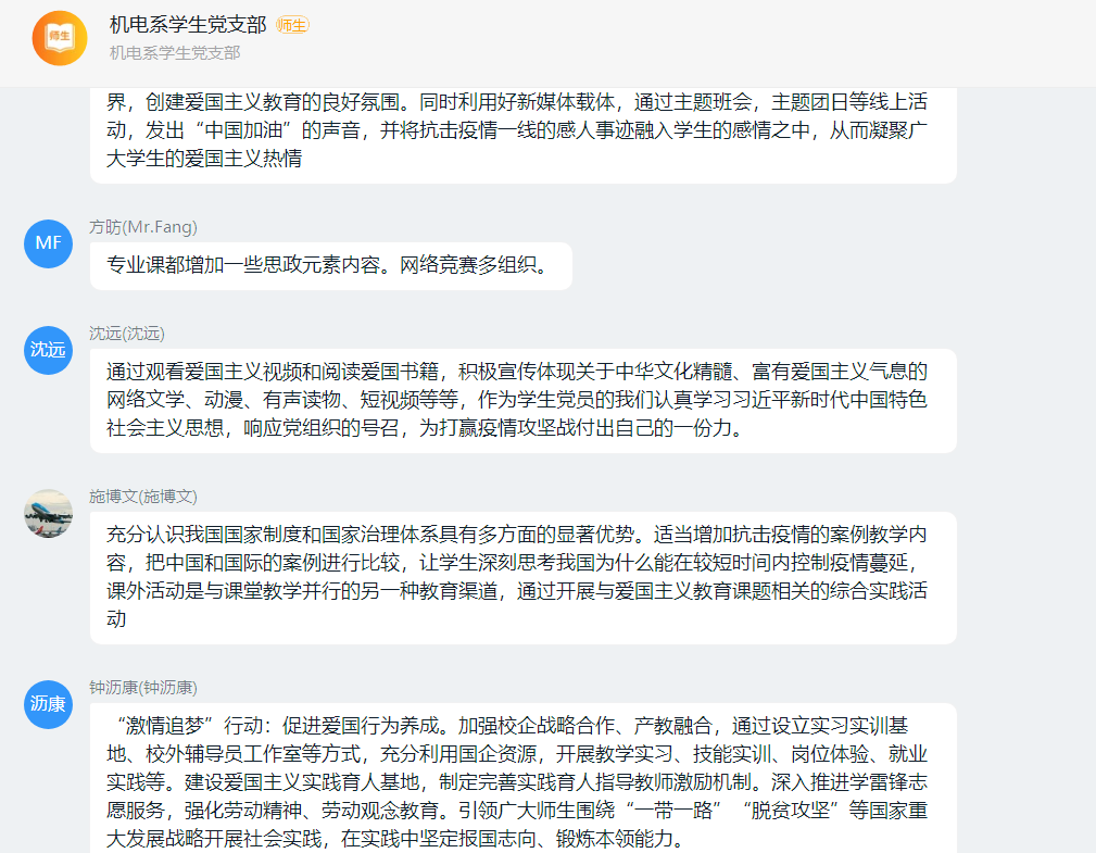 随后,各支部书记还组织大家学习了《习近平总书记在决战决胜脱贫攻坚座谈会上的讲话》的内容。《讲话》肯定了目前脱贫攻坚工作的成果,分析了目前脱贫攻坚的局势,同时针对新冠疫情的影响进行了新的动员和部署。最后,各支部结合实际,学习了中共中央党组印发的《教育系统关于学习宣传贯彻落实<新时代爱国主义教育实施纲要>的工作方案》文件精神,并根据《方案》内容和要求,进行了关于“如何把爱国主义教育作为课程思政的重要内容落实到教学过程中”和“如何通过新媒体渠道把中国抗击疫情的事迹转化为学生的爱国热情”的大讨论。蒋晓冬书记指出,我们不仅要做好专业课程的课程思政建设,同时充分利用大学生第二课堂做好爱国主义教育,通过漫画比赛、演讲比赛、征文比赛等多种形式把此次中国在抗击疫情中的政策和成效与其他国家的做法进行比较,让大学生认识到我国社会主义制度的优越性,要不断挖掘身边参加抗疫的志愿者同学,让身边事迹感染人,发挥正能量的引导作用,推动大学生爱国行动。蒋元星老师认为,教师应该结合教学案例展开思政教育,如在《计算机控制》课程中,让学生观看《大国重器》等视频,进行拓展学习,引导正确世界观、人生观、价值观的形成;同时,要把握政治引导的度,引导的方向要正确。汪骅老师认为,新媒体平台应注重开展爱国主义教育,讲好中国抗“疫”故事,以火神山医院、雷神山医院拔地而起的“中国速度”和白衣天使、解放军战士等“最美逆行者”形成的“中国力量”作为出发点,利用新媒体载体,通过主题班会、主题团日等线上活动,将抗击疫情一线的感人事迹融入学生的朴素感情,凝聚广大青年的爱国主义热情。
