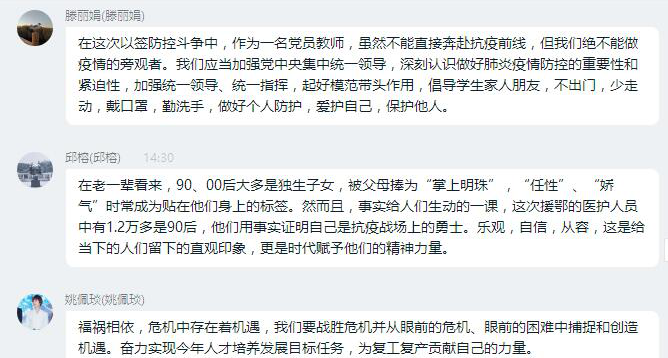 接着,大家学习了《习近平给北大援鄂医疗队全体“90后”党员的回信》的重要精神,在这次抗击疫情的斗争中,以“90后”为代表的青年一代挺身而出、担当奉献,以实际行动扛起了责任担当,回应了党和人民的期望,彰显了家国情怀和青春力量。一线的青年医务工作者,义无反顾、白衣执甲、逆行出征,展现出最绚美的时代风采。机电系党支部也有许多“90后”党员,他们纷纷表示,作为大学生党员和青年教师党员,虽然不能直接奔赴抗疫前线,但我们绝不能做疫情的旁观者。我们要起好模范带头作用,提醒家人朋友珍惜目前国内疫情防控成果,不能放松警惕,少去人多的地方,戴口罩,勤洗手,做好个人防护。我们还要把这次的疫情当作是一个学习的机会,学习医务人员这种处变不惊、舍己为人的精神,树立正确的人生观、价值观。