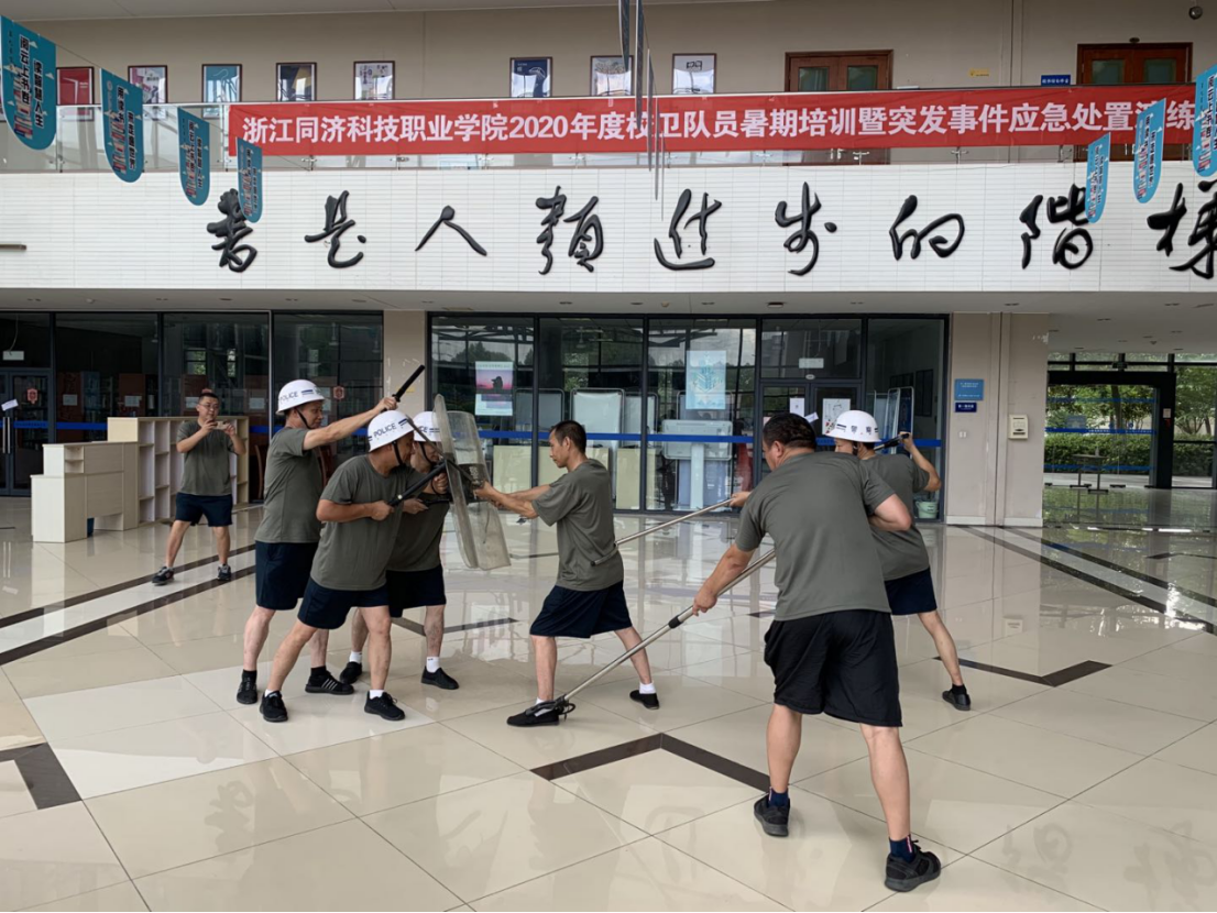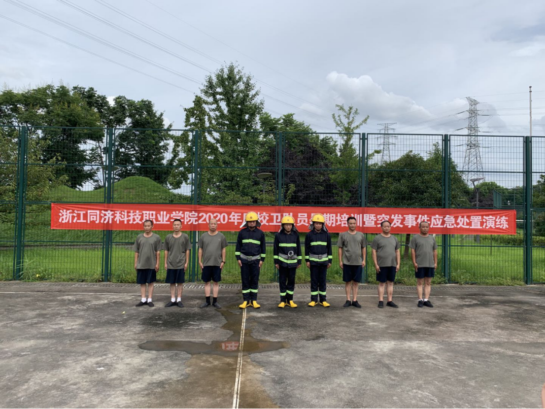 为期一周的培训中,班队长率先垂范,带领队员认真学习了学院安全工作规章制度,进行了军姿、队列、消防、应急救护、反恐防暴等业务技能的强化训练,应对突发事件应急处置演练。期间张处长多次赴训练场为校卫队员加油鼓劲。全体校卫队员冒着骄阳酷暑,以高昂的斗志,坚韧的毅力,顽强的作风,圆满地完成了各项训练任务,熟练掌握了队列和体能训练要领以及各项消防安全技能,全面提高了校卫队员的综合业务素质,增强了队伍战斗力,充分展示了校卫队良好的精神面貌以及坚决捍卫校园安全稳定的信心和勇气。