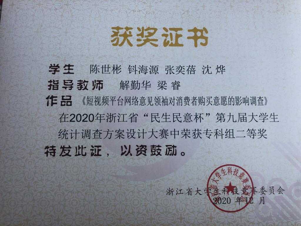 近日,浙江省“民生民意杯”第九届大学生统计调查方案设计大赛决赛在杭州师范大学仓前校区圆满落幕。我系19级会计专业沈烨、陈世彬、钭海源和张奕蓓组成的代表队荣获团体二等奖,19级互联网金融专业赵乐娜、郑江坤、罗欣睿、王璐巧以及19级互联网金融改革实验班华津乐、曹恒伟同学组成的代表方分别荣获团体三等奖。
