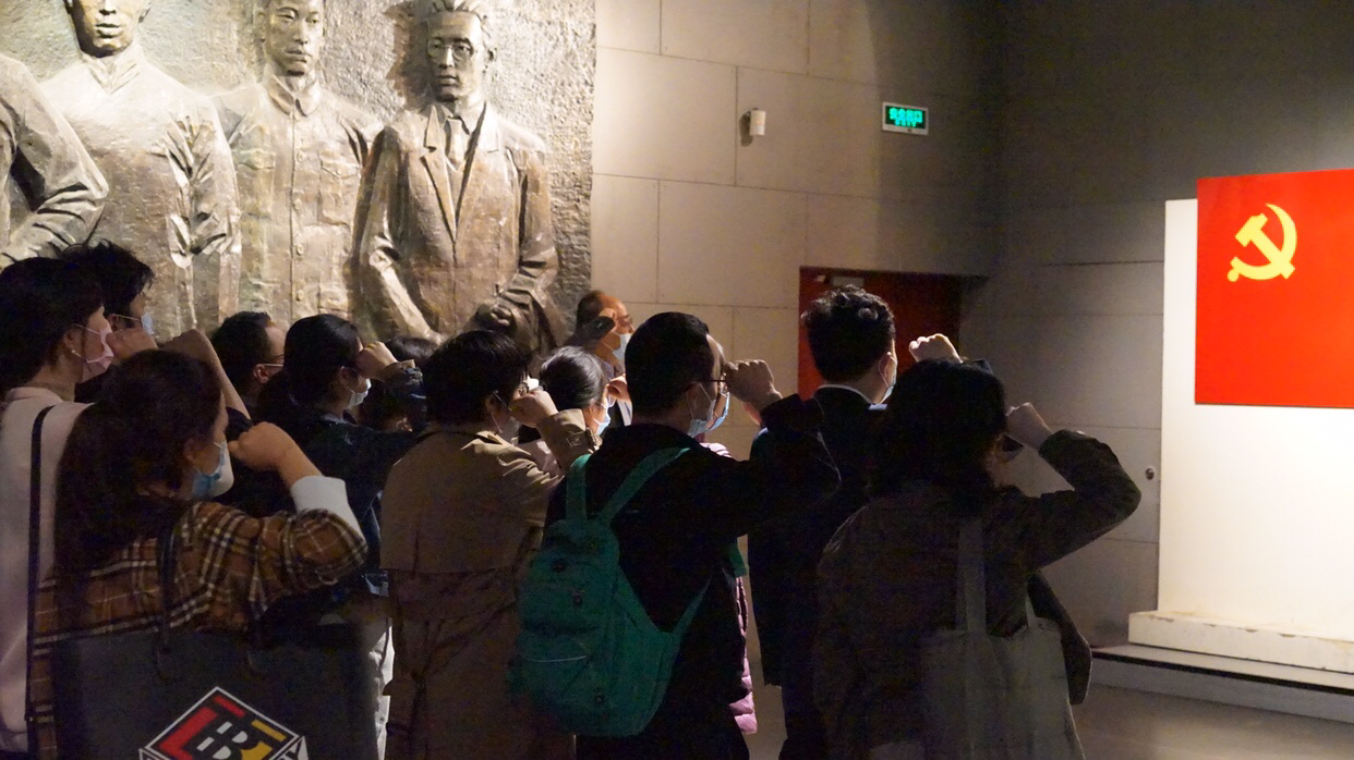 在展区中,一面庄严的党旗让党员们停下了参观的脚步。大家面向党旗,再一次庄严宣誓,重温入党誓词时的承诺和决心,在党旗下接受心灵的净化和洗礼,牢记共产党员的政治责任和历史使命。