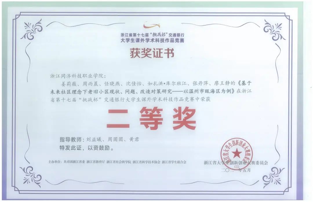 5月16日,浙江省第十七届“挑战杯”交通银行大学生课外学术科技作品竞赛在浙江师范大学落下帷幕。本次大赛全省共有106所高校、4万余名大学生参赛,遴选推荐出1633件作品参加省级复赛。经复赛选拔,共有50所高校的323件作品入围主体赛省级决赛。最后,艺术设计学院由刘益曦、周圆圆、黄君老师带队的《基于未来社区理念下老旧小区现状、问题、改造对策研究——以温州市瓯海区为例》项目取得了省级二等奖的好成绩。