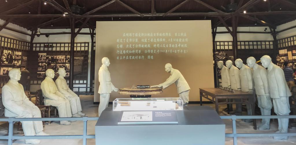 浙江受降纪念馆由地上建筑和地下展厅组成,地下展厅分为“侵略暴行”“不屈抗战”“胜利欢庆”三大部分。几多风雨,几多艰险,难忘抗战先烈;千关不阻,万战不怯,只为收复河山。伴随他们抗争前进步伐的是一声声积蓄已久的呐喊,是一句句荡气回肠的高歌。盟员们观看了日本入侵给浙江带来的人口伤亡和财产损失数字与照片,观看了浙江人民的抗日英雄与群众事迹,观看了接受浙江地区日军投降的仪式模拟场景等。在民盟与抗战专栏,介绍了黄炎培、张澜、沈钧儒、胡愈之、陶行之、杨明轩、史良等民盟先辈为抗日运动做了许多卓越工作的事迹,对日本入侵进行坚决斗争的情况。民盟先辈充分体现了一代知识分子的爱国情操和高尚风骨。