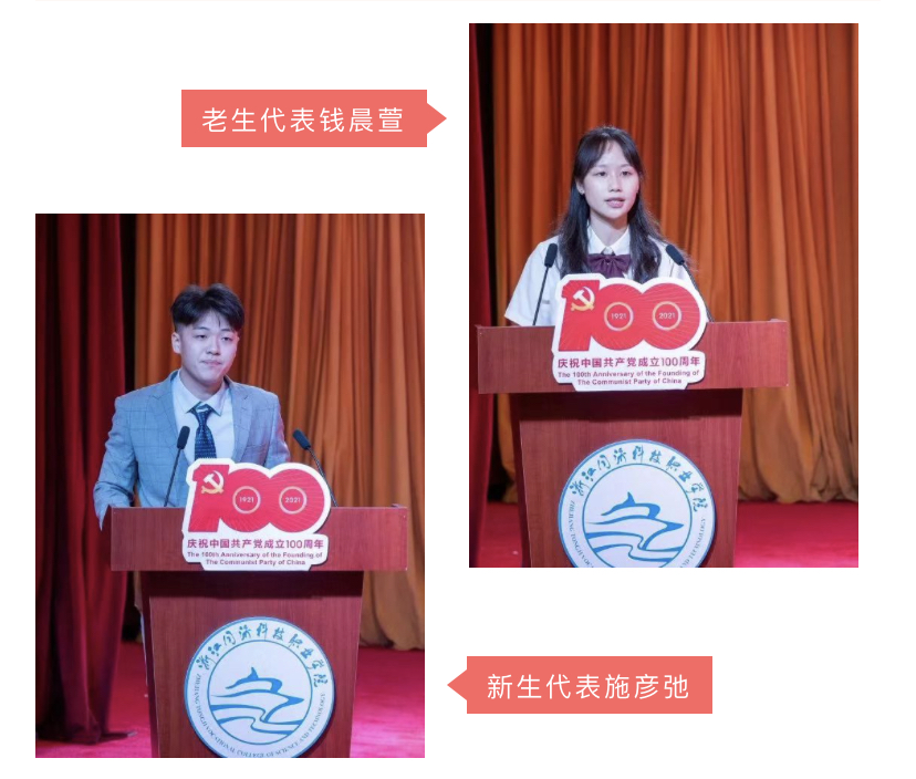 20级老生代表,来自2020杭州造价改革实验班的钱晨萱在发言中分享了自己在学院两年的心路历程和点滴收获,希望大一的学弟学妹们能够充分利用大学给予的资源和条件,拥有积极乐观,实事求是的生活态度。市政2102的施彦弛作为新生代表,讲述了自己初来学校的新鲜感受,分享了自己成为一名大学生的喜悦之情,呼吁广大新生们要珍惜大学的时光,不负青春韶华,争做时代的弄潮儿。