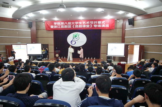 10月28日12:30,学院第八届大学生艺术节开幕式暨昆剧艺术讲座在信息楼报告厅举行。学院副院长吴宏平、各系党总支书记、团委负责人、各系团总支书记以及500余名学生代表参加本次开幕式。 吴副院长上台致开幕词,他对本届艺术节成功举行表示祝贺,希望大家利用学院搭建的艺术舞台,充分发挥自身的聪明才智和艺术才能,尽情演绎自我才华,放大自身亮点,开发无限潜能,凝聚力量,携手奋进,用青春和智慧共同推进校园艺术文化更好地发展。团委副书记叶乐介绍本届艺术节的活动安排。 开幕式结束后,浙江省昆剧团为同学们带来了昆剧艺术讲座《牡丹亭.惊梦》,昆剧团老师们的精彩讲座和精湛表演给大家带来一场视听盛宴,使大家感受了国粹艺术不一样的魅力。