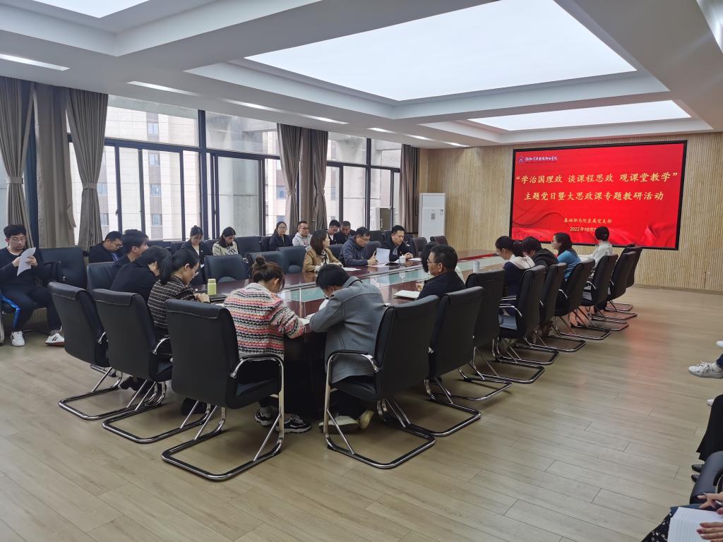 10月26日,基础部、马院举行“学治国理政 谈课程思政 观课堂教学”主题党日暨大思政课专题教研活动。基础部直属党支部副书记张春平主持会议,学校党委委员、宣传部长吴敏启,马院主持工作副院长阮红芳以及基础部马院全体党员、教研室主任参加活动。