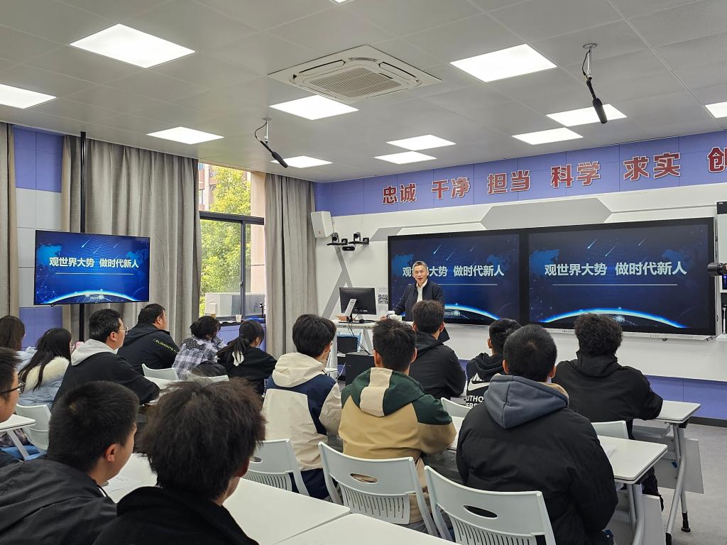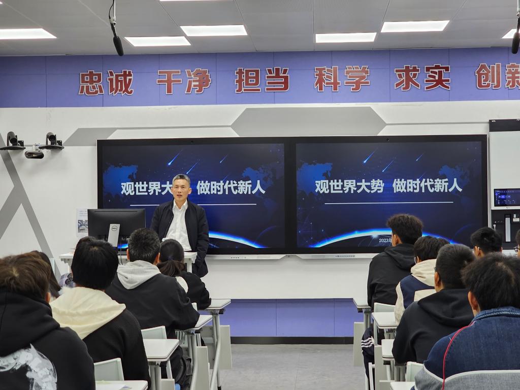 “思政课是一门什么样的课,它到底想教给我们什么?”“百年未有之大变局“变”在何处?”……11月16日,学校党委副书记、校长王卫标以《观世界大势 做时代新人》为题为大禹班2023级全体学生讲授思政课,与青年大学生共同探讨世界格局变化带来的影响,分析职教学生担负的责任和使命。